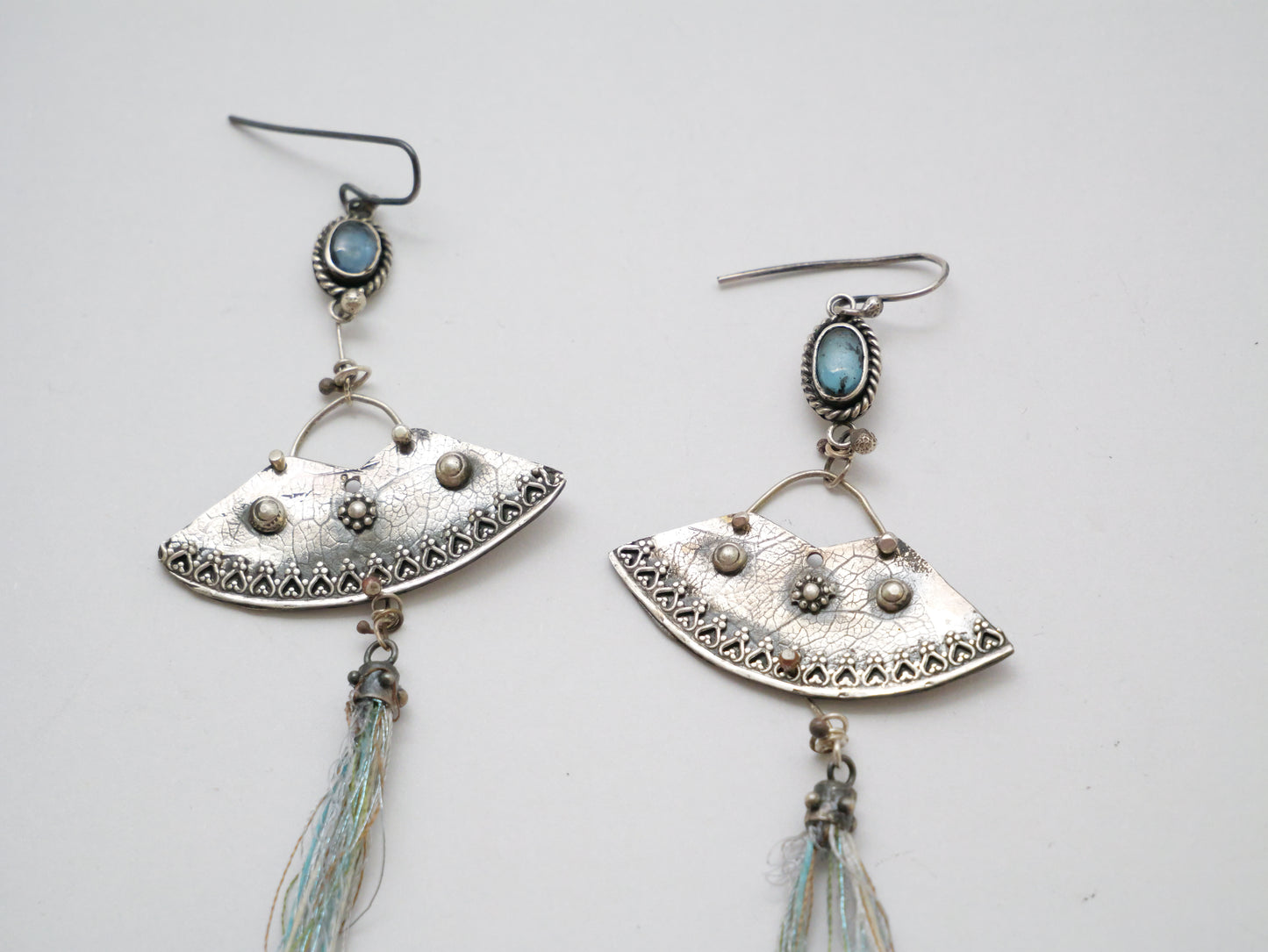 EARRINGS 23: STERLING SILVER DROP WITH ADORNMENTS, FIBER AND KYANITE