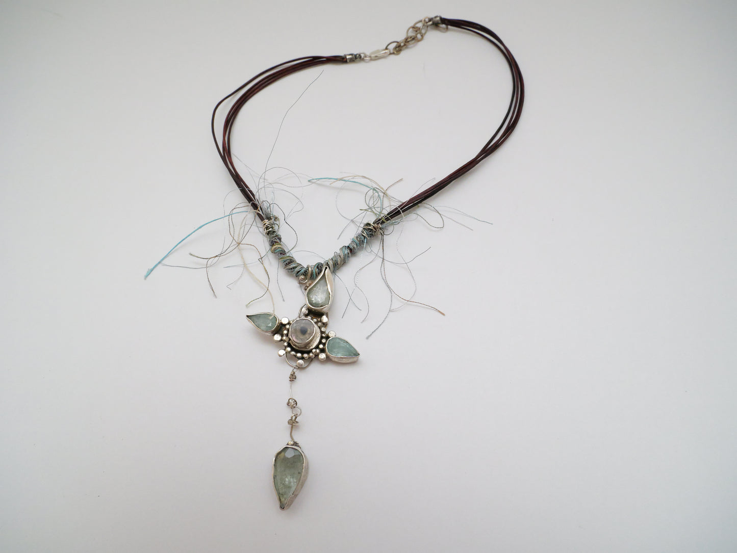 NECKLACE 11: LEATHER CHOKER WITH AQUAMARINE, RAINBOW TOURMALINE AND FIBERS