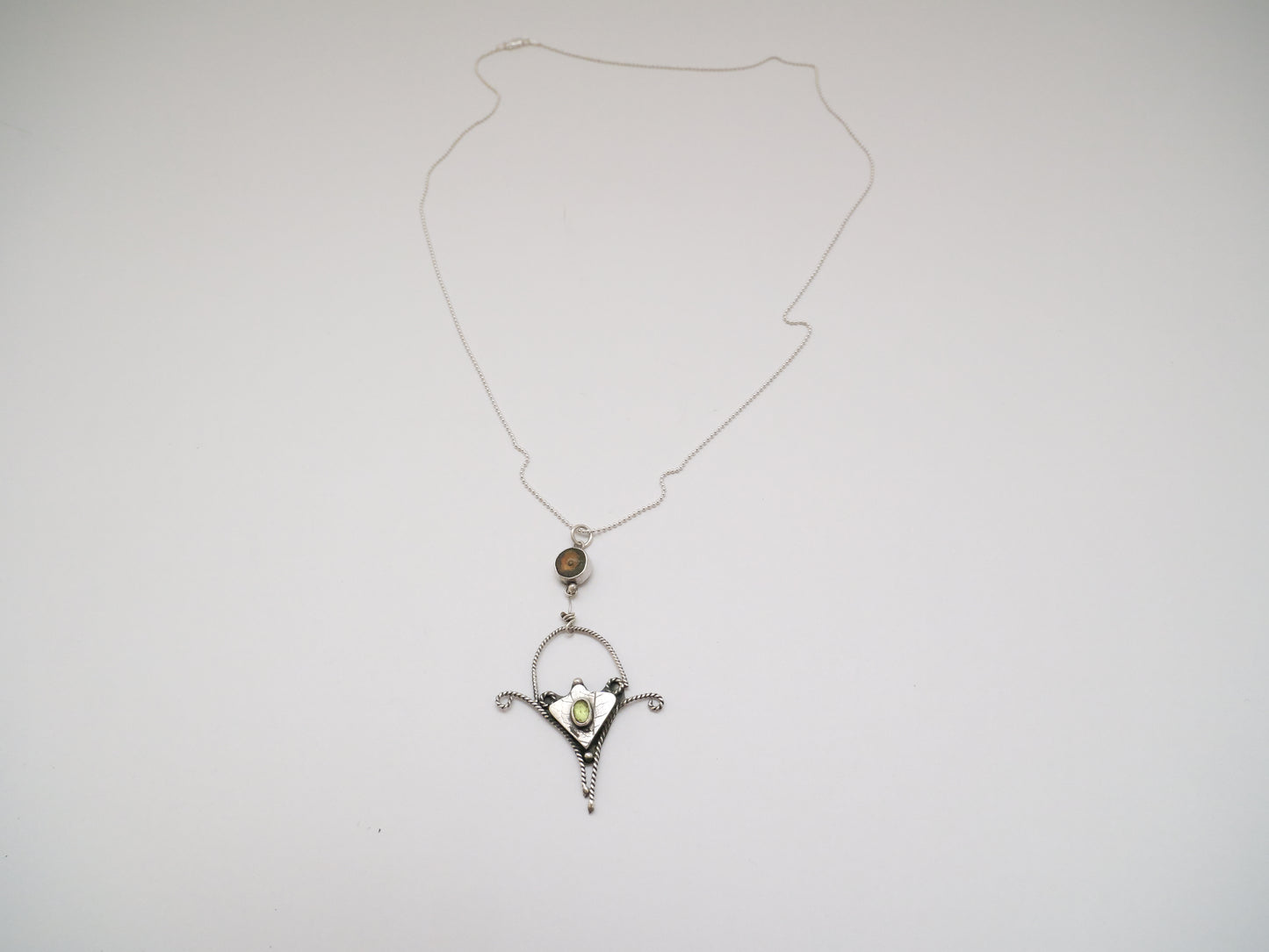 NECKLACE 13: LEATHER CHOKER WITH AQUAMARINE, PERIDOT, STERLING SILVER ADORNMENTS AND FIBERS