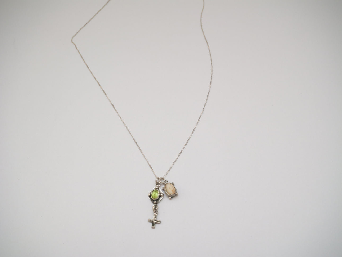 NECKLACE 32: STERLING SILVER CHAIN WITH PERIDOT, ANCIENT SLICED WALRUS TOOTH CHARMS