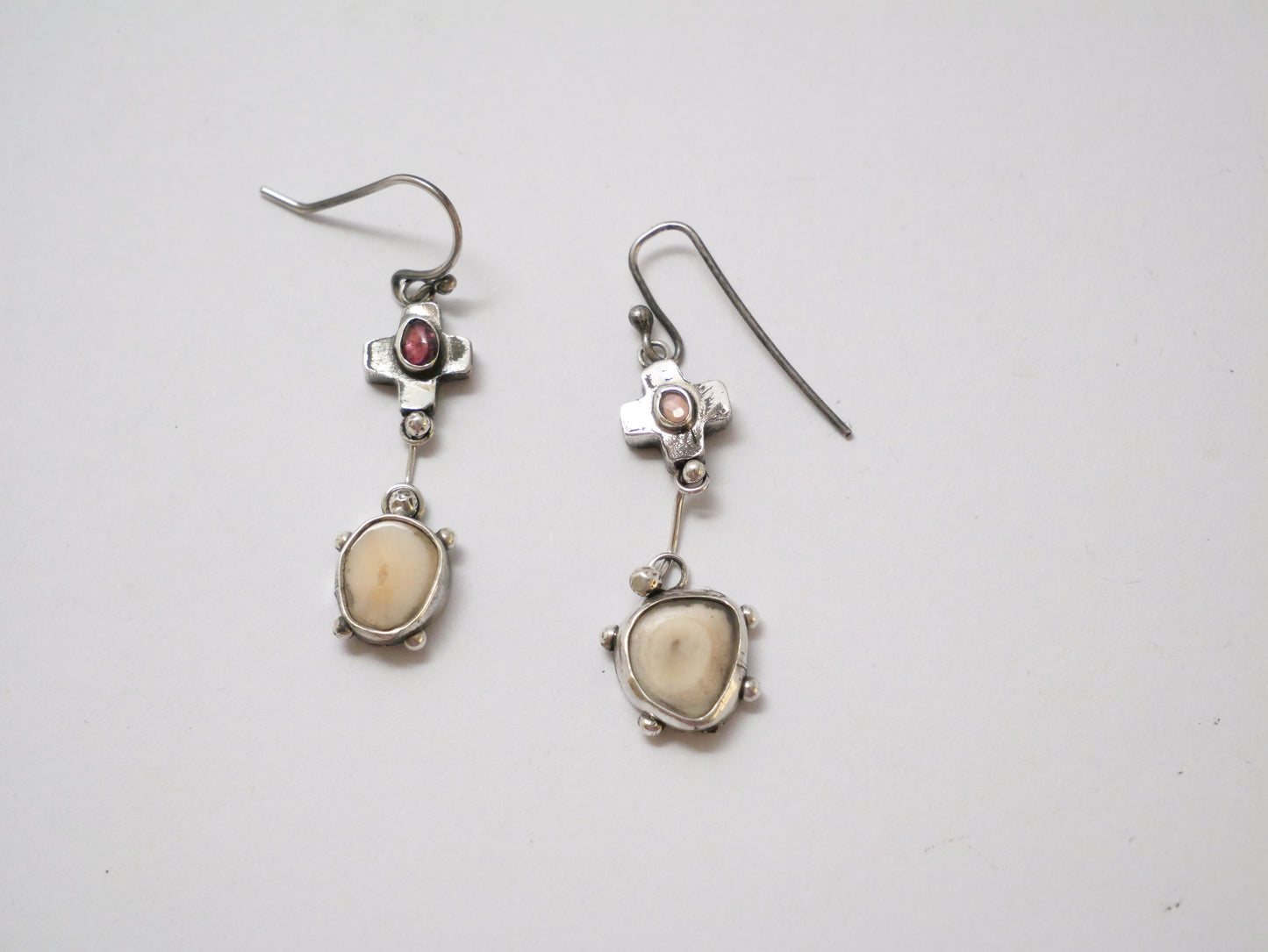 EARRINGS 14: STERLING SILVER DROP WITH RAINBOW TOURMALINE AND ANCIENT SLICED WALRUS TOOTH