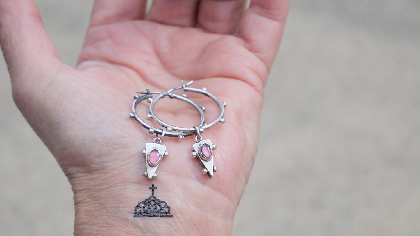 EARRINGS 34: STERLING SILVER HOOP WITH GRANULATIONS AND HOLLOW FORMS WITH RAINBOW TOURMALINE