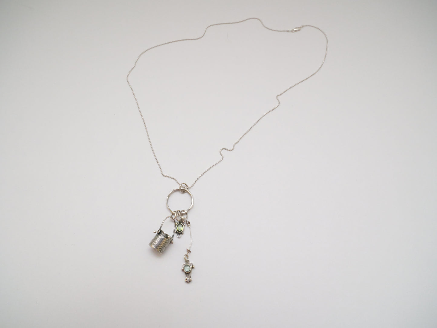 NECKLACE 28: STERLING SILVER CHAIN WITH RAINBOW TOURMALINE, PERIDOT, PRAYER BOX AND ADORNMENTS CHARMS