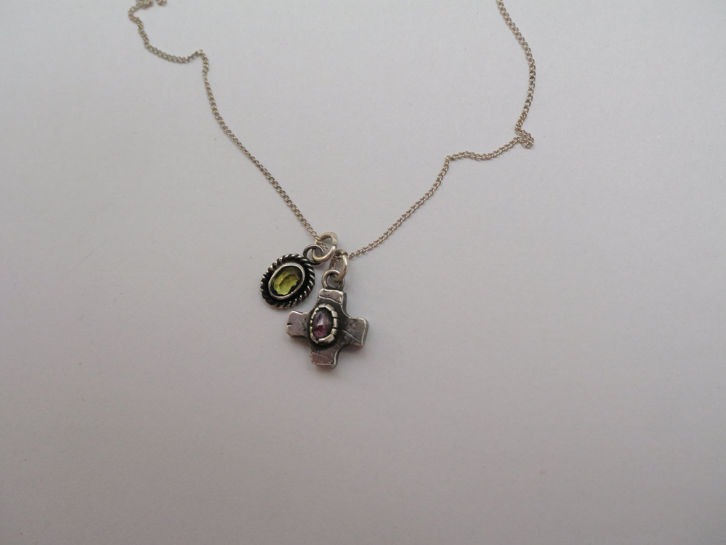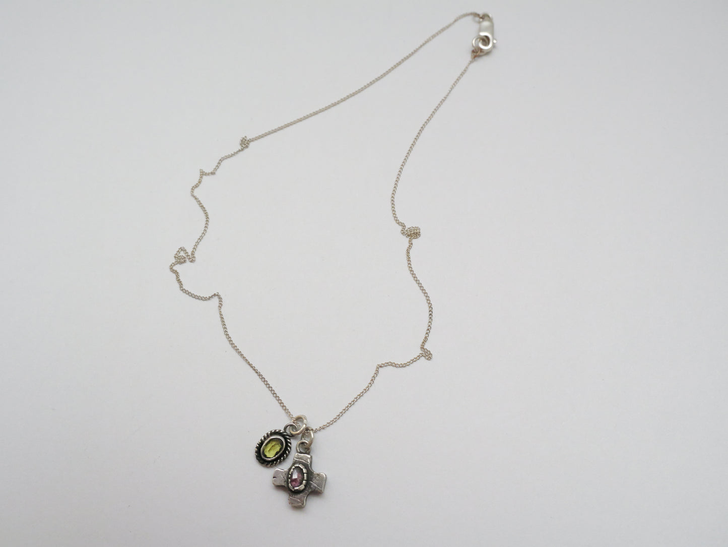 NECKLACE 38: STERLING SILVER CHAIN WITH RAINBOW TOURMALINE, PERIDOT CHARMS