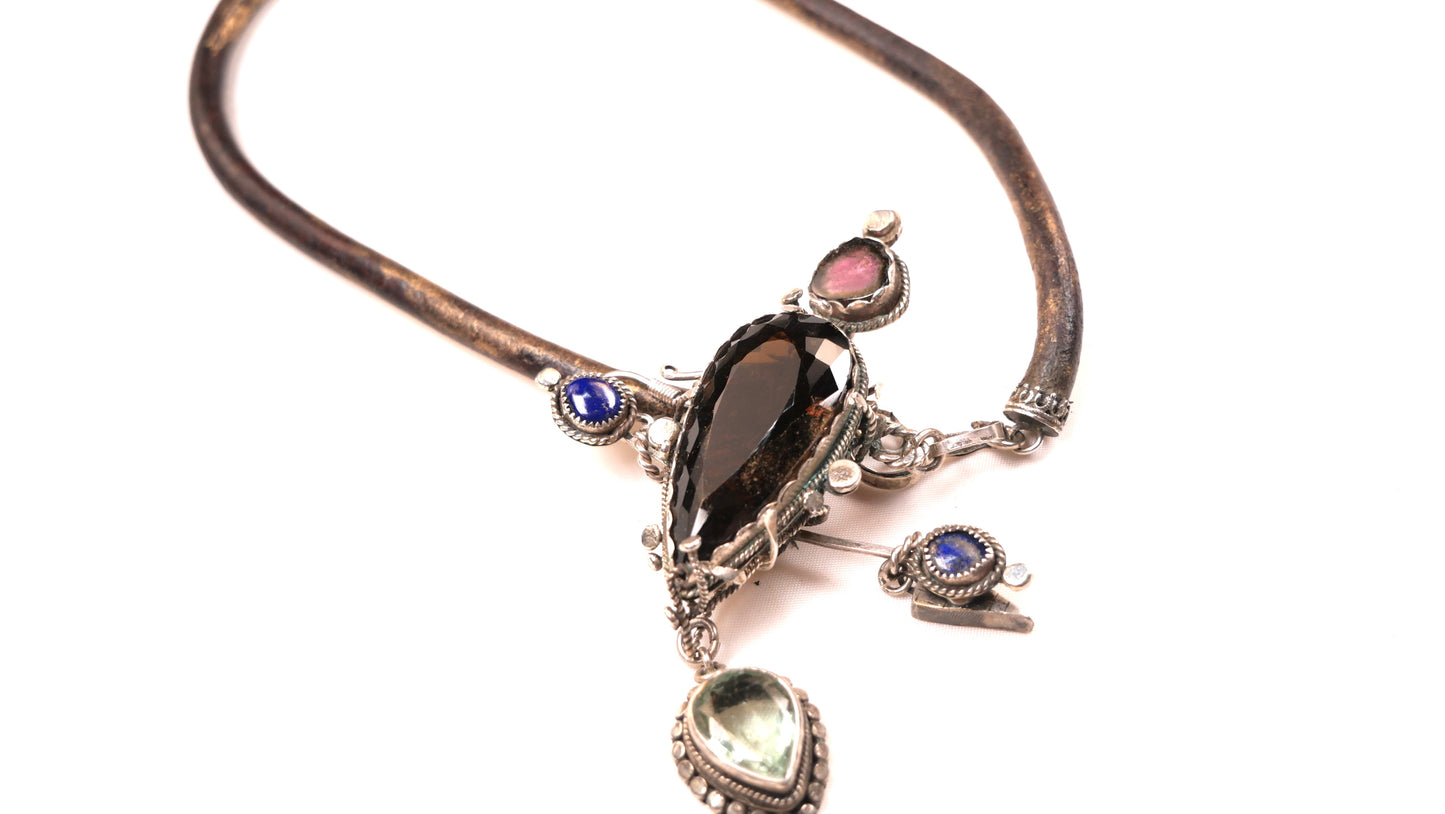 Powerful Peace Reliquary – Large reliquary crafted for power, featuring honey quartz for peace and happiness, alongside rainbow tourmaline, garnet, and labradorite with leather.