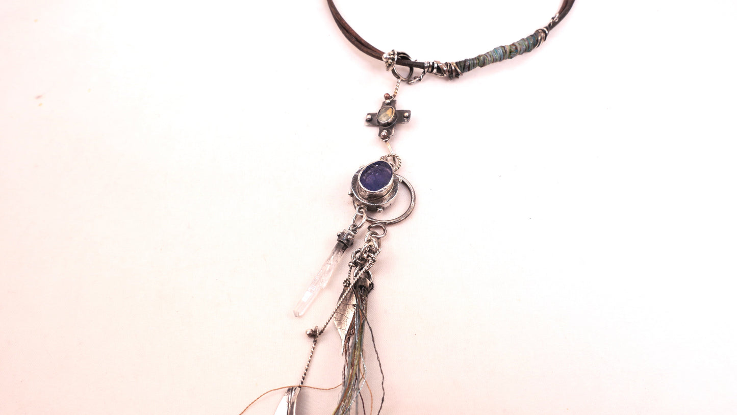 Strength and Romance Reliquary – This powerful reliquary holds the strength and delicate energy of nature. Adorned with morganite, representing romance and love, along with crystal quartz, fluorite, and sterling silver on leather, it symbolizes endless life, abundance, and protection.