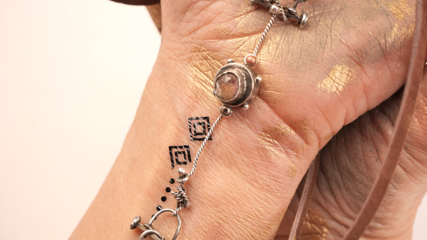 Endless Life Necklace Reliquary – This reliquary symbolizes endless life, fulfillment, and protection. Featuring a raw tourmaline stone, sterling silver, and leather, it is a versatile piece that can be worn as a choker or long necklace, offering both strength and beauty.